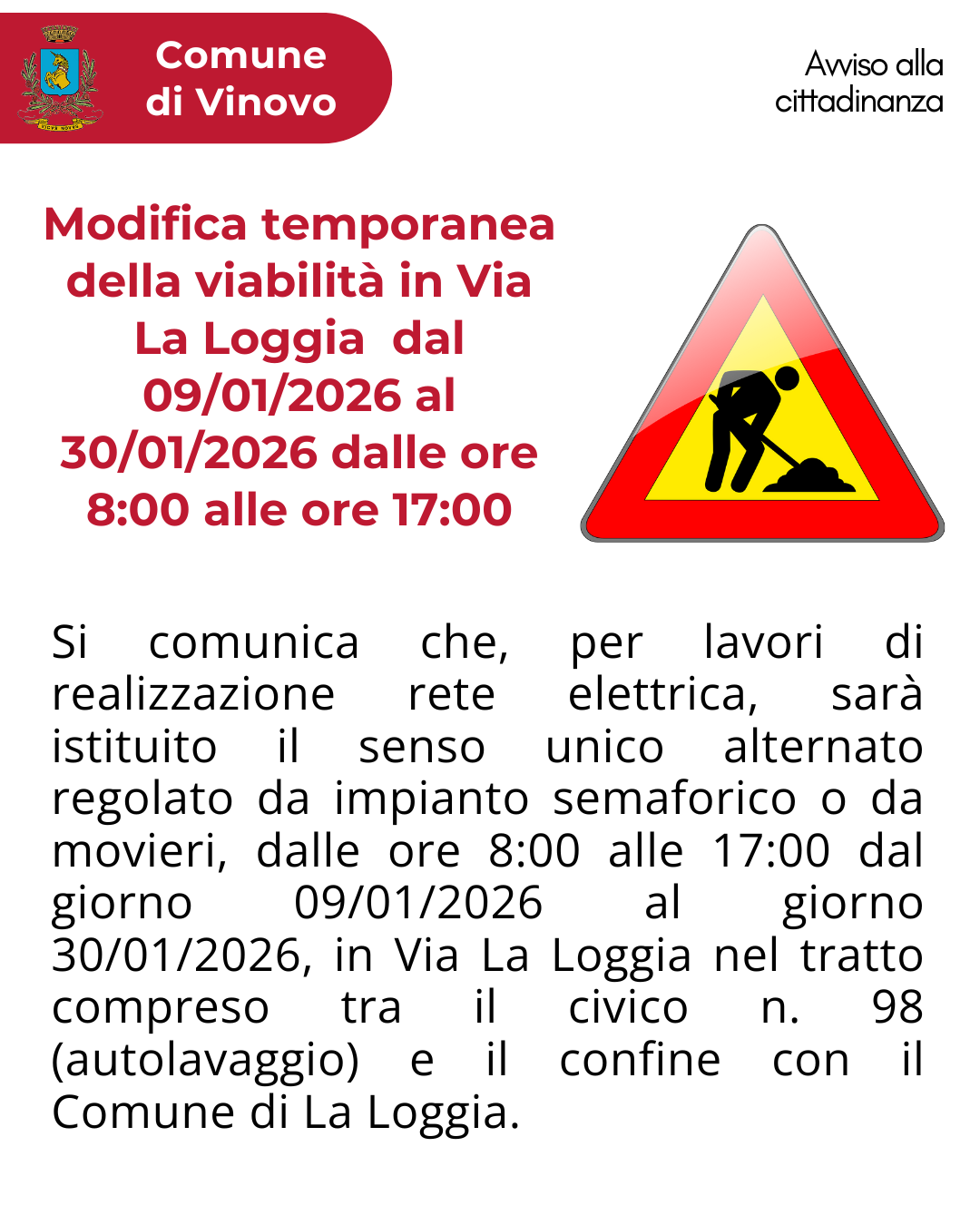Si comunica che, per lavori di realizzazione rete elettrica, sarà istituito il senso unico alternato regolato da impianto semaforico o da movieri, dalle ore 8:00 alle 17:00 dal giorno 09/01/2026 al giorno 30/01/2026, in Via La Loggia nel tratto compreso tra il civico n. 98 (autolavaggio) e il confine con il Comune di La Loggia.