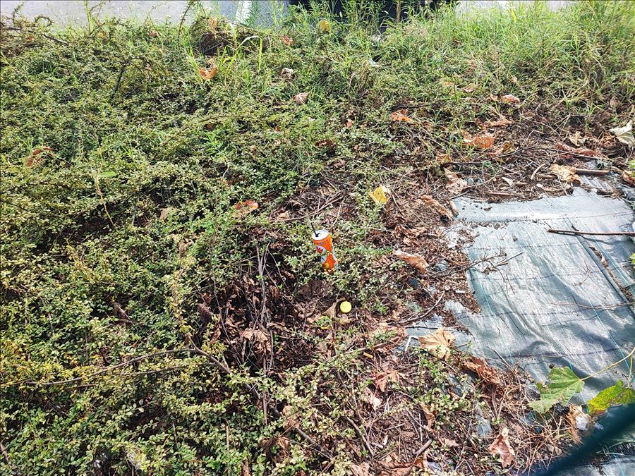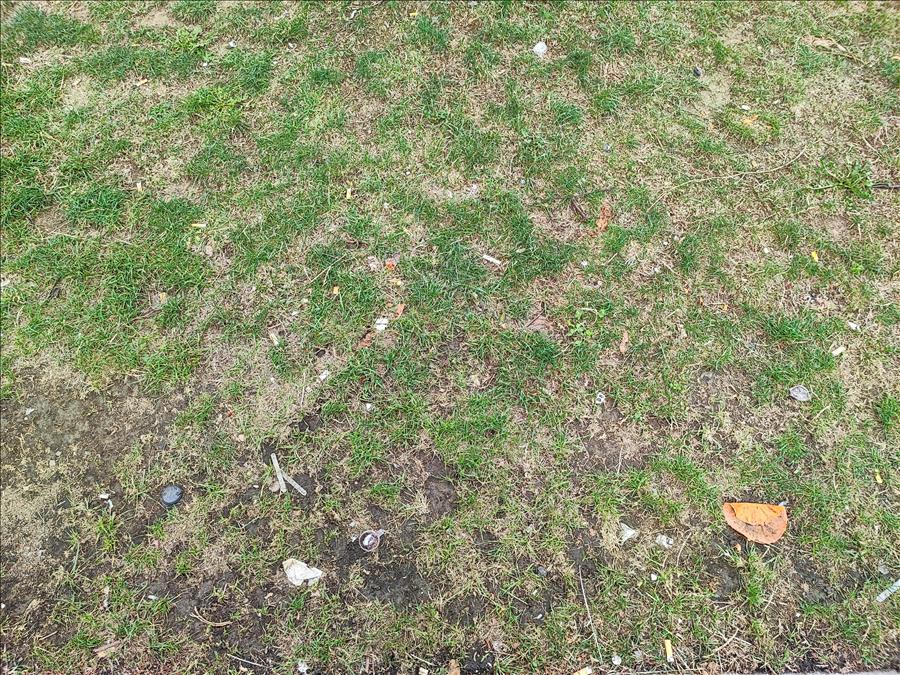 Presenza di immondizia nell'area giochi, nel manto erboso e nella zona pacciamata limitrofa, adibita a parcheggio veicolare: mozziconi di sigaretta, tappi plastici,tappi metallici,cellophane di pacchetti di sigarette, brandelli di palloncini plastici, involucri di caramelle, lattine in alluminio,cartoncini,...per citarne alcuni.