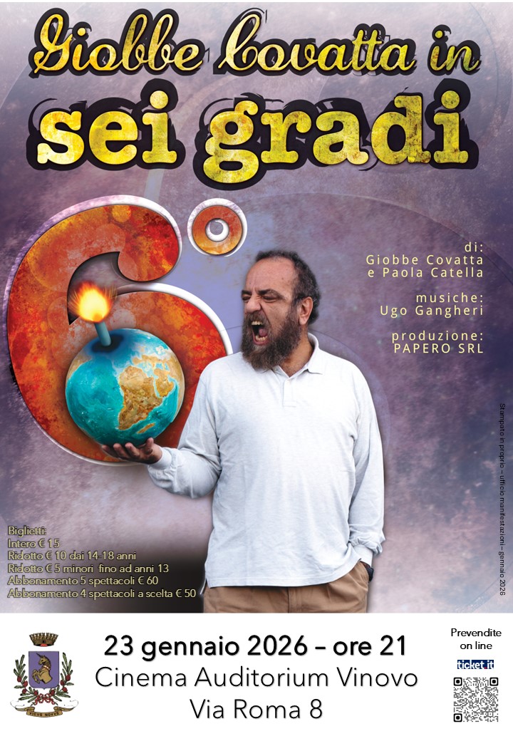 Lo spettacolo “6° (Sei gradi)” di Giobbe Covatta prende il titolo dall’aumento in gradi centigradi della temperatura della Terra. La storia è collocata nel futuro in diversi periodi storici nei quali la temperatura media della terra sarà aumentata di uno, due, tre, quattro, cinque e sei gradi. I protagonisti sono i nostri discendenti, che erediteranno il mondo così com’è lasciato da noi. Covatta utilizza modelli matematici ed ecologici scientificamente fondati per mostrare le conseguenze dei cambiamenti climatici. Il comico immagina soluzioni drammatiche e stravaganti che l’uomo metterà in atto per far fronte ad una drammatica emergenza ambientale e sociale. I discendenti potrebbero giudicare severamente le scelte dei loro antenati. Comicità, ironia e satira si intrecciano con la divulgazione scientifica sulle emergenze ambientali e sociali.