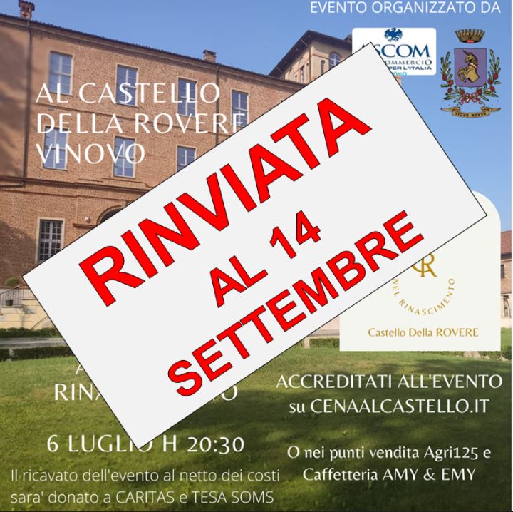 La cena rinascimentale prevista per mercoledì 6 luglio è rinviata a mercoledì 14 settembre per probabile maltempo.