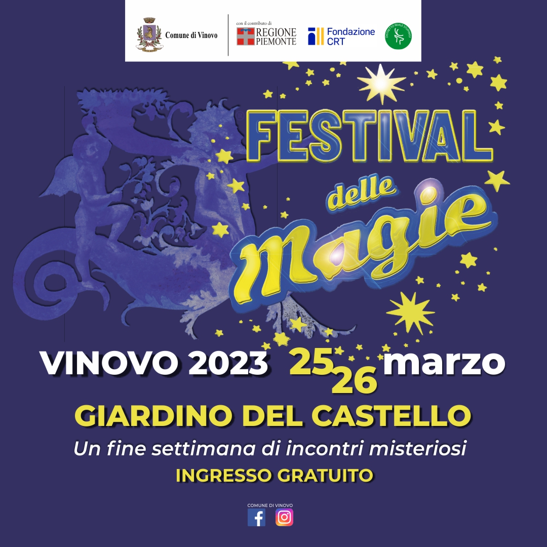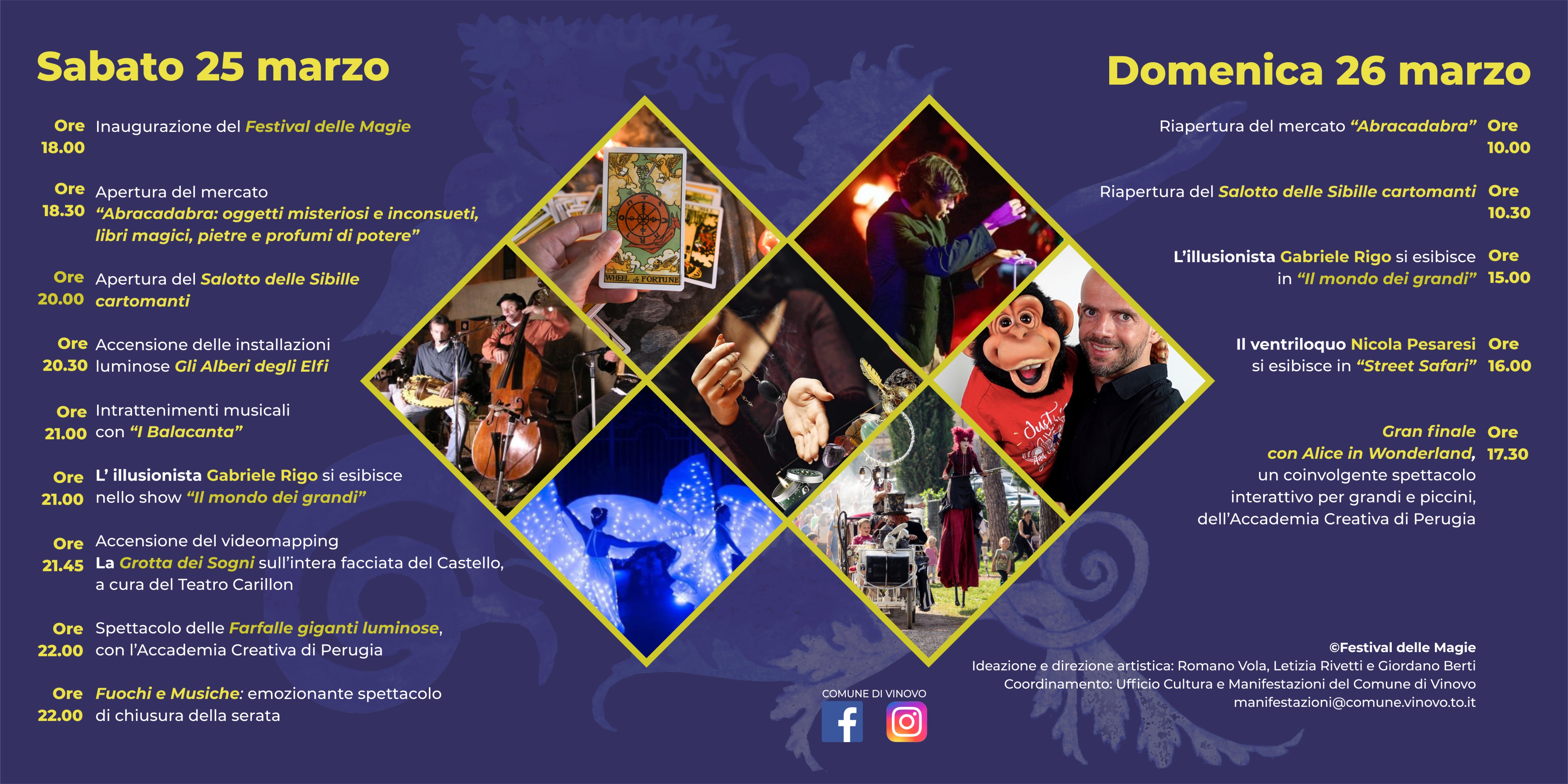 Dopo lo straordinario successo ottenuto nelle prime due edizioni, svoltesi in Alta Langa, il Festival delle Magie approda a Vinovo con la medesima formula che lo ha reso vincente: videomapping, installazioni illuminotecniche, spettacoli di teatro di strada, musicanti, giocolieri, espositori di artigianato artistico, produttori enogastronomici selezionati per qualità.