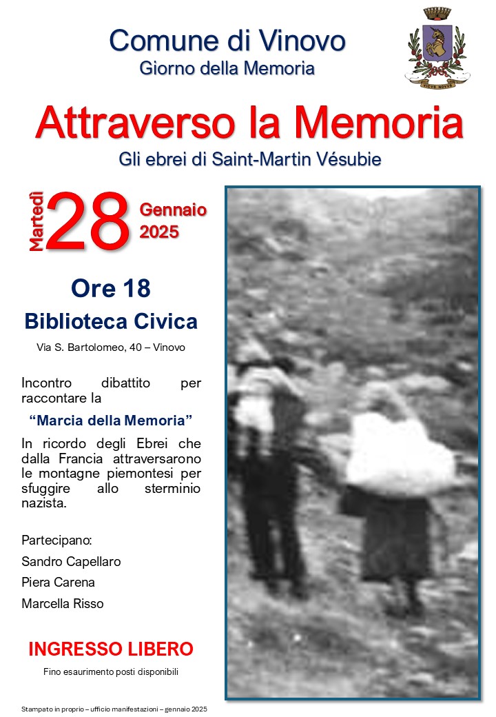 Il Comune di Vinovo, in occasione della Giornata Internazionale in memoria delle vittime dell'Olocausto, organizza un dibattito per raccontare la "Marcia della Memoria" in ricordo degli ebrei che dalla Francia attraversarono le montagne piemontesi per sfuggire allo sterminio nazista.