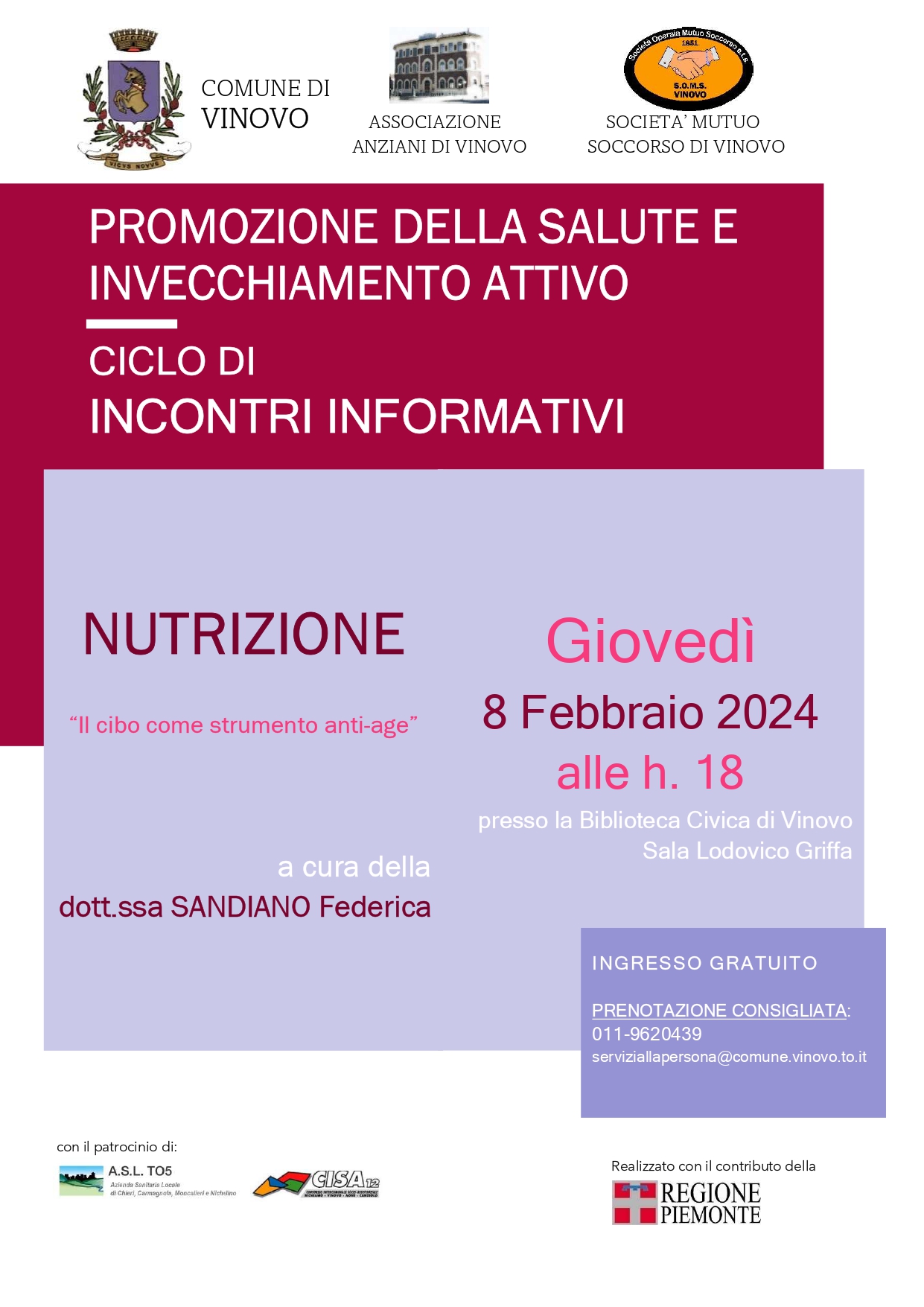 Giovedì 8 Febbraio 2024 alle ore 18, presso la Biblioteca Civica di Vinovo, si svolgerà il secondo incontro informativo sulla promozione della salute e invecchiamento attivo.