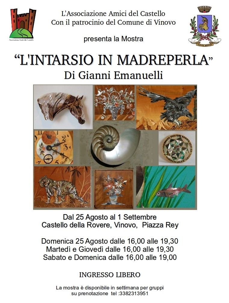 L'associazione Amici del Castello con il patrocinio del Comune di Vinovo ospitano presso le sale del Castello Della Rovere la mostra "L'intarsio in madreperla" di Gianni Emanuelli.