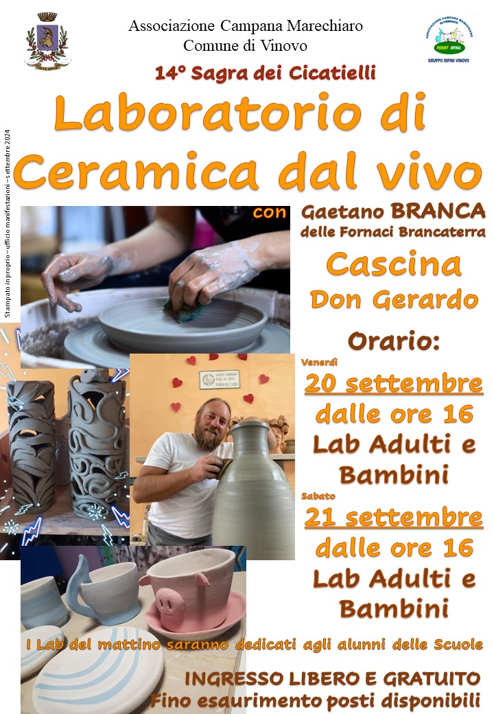In occasione della 14° Sagra dei cicatielli, il Comune di Vinovo in collaborazione con l'associazione Campana Marechiaro organizza un laboratorio di ceramica dal vivo con il maestro Gaetano Branca delle Fornaci Brancaterra.