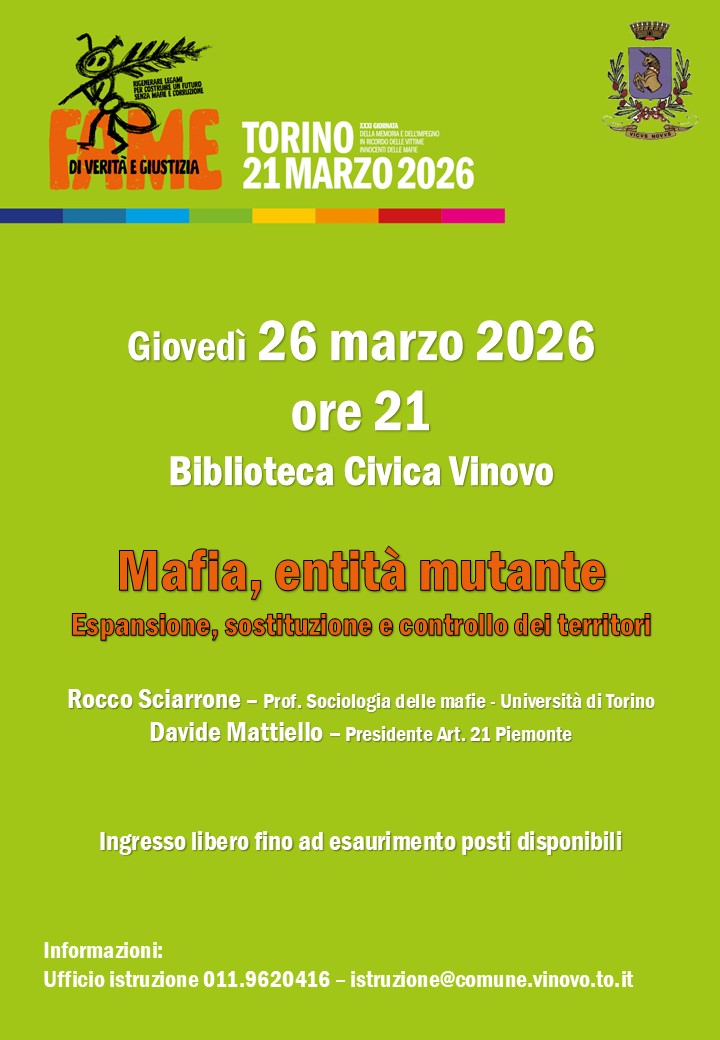 In occasione della Giornata nazionale della memoria e dell'impegno in ricordo delle vittime innocenti delle mafie, giovedì 26 marzo alle ore 21 in Biblioteca il Comune di Vinovo presenta l’incontro "MAFIA, ENTITÀ MUTANTE. Espansione, sostituzione e controllo dei territori".