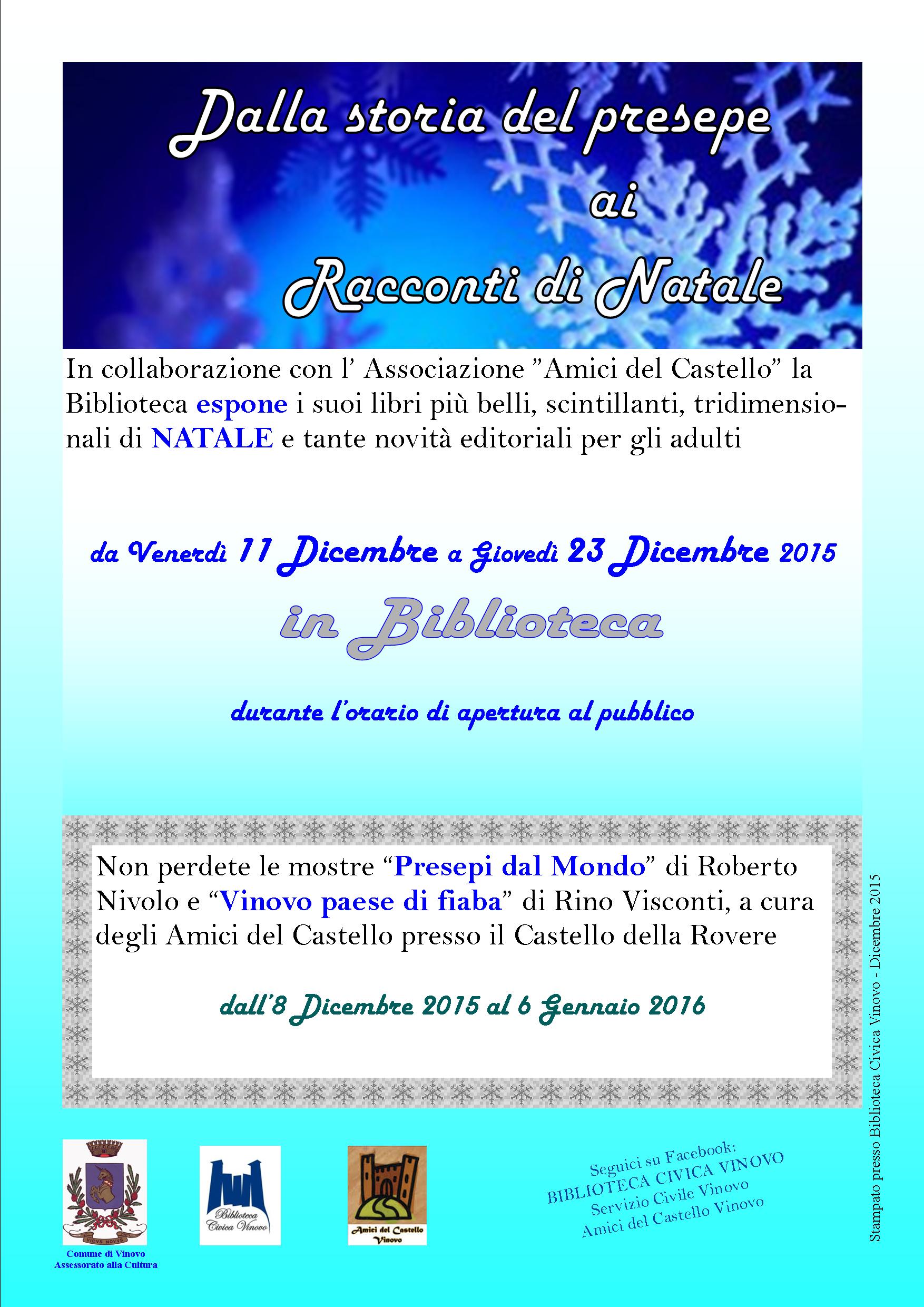 Grande mostra di decine di libri sul Natale e i Presepi nella sala adulti della Biblioteca Civica (11 - 24 dicembre 2015), aperta durante il consueto orario e in altri per visite scolastiche. Iniziativa dell'Assessorato alla Cultura e Biblioteca, concomitante alle iniziative con la collaborazione dell'Associazione "Amici del Catello" di Vinovo.