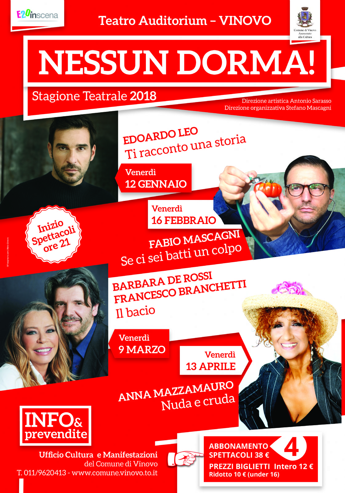 "Nessun dorma" è la nuova stagione teatrale che l'Assessorato alla Cultura del Comune di Vinovo propongono in collaborazione con E20inscena.