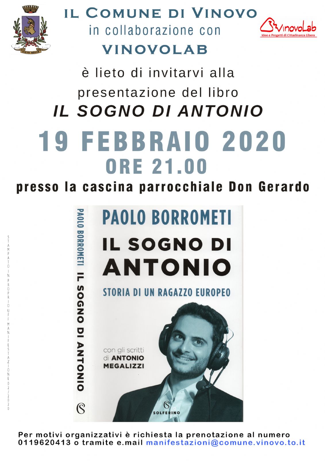 Il Comune di Vinovo in collaborazione con l'Associazione VinovoLab è lieto di invitarVi alla presentazione del libro "Il sogno di Antonio" di Paolo Borrometi.