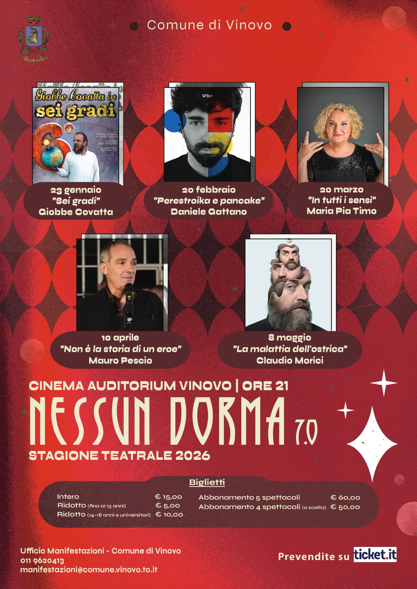 Come di consueto, tutti gli spettacoli vanno in scena il venerdì alle ore 21 al Cinema Auditorium di Vinovo.