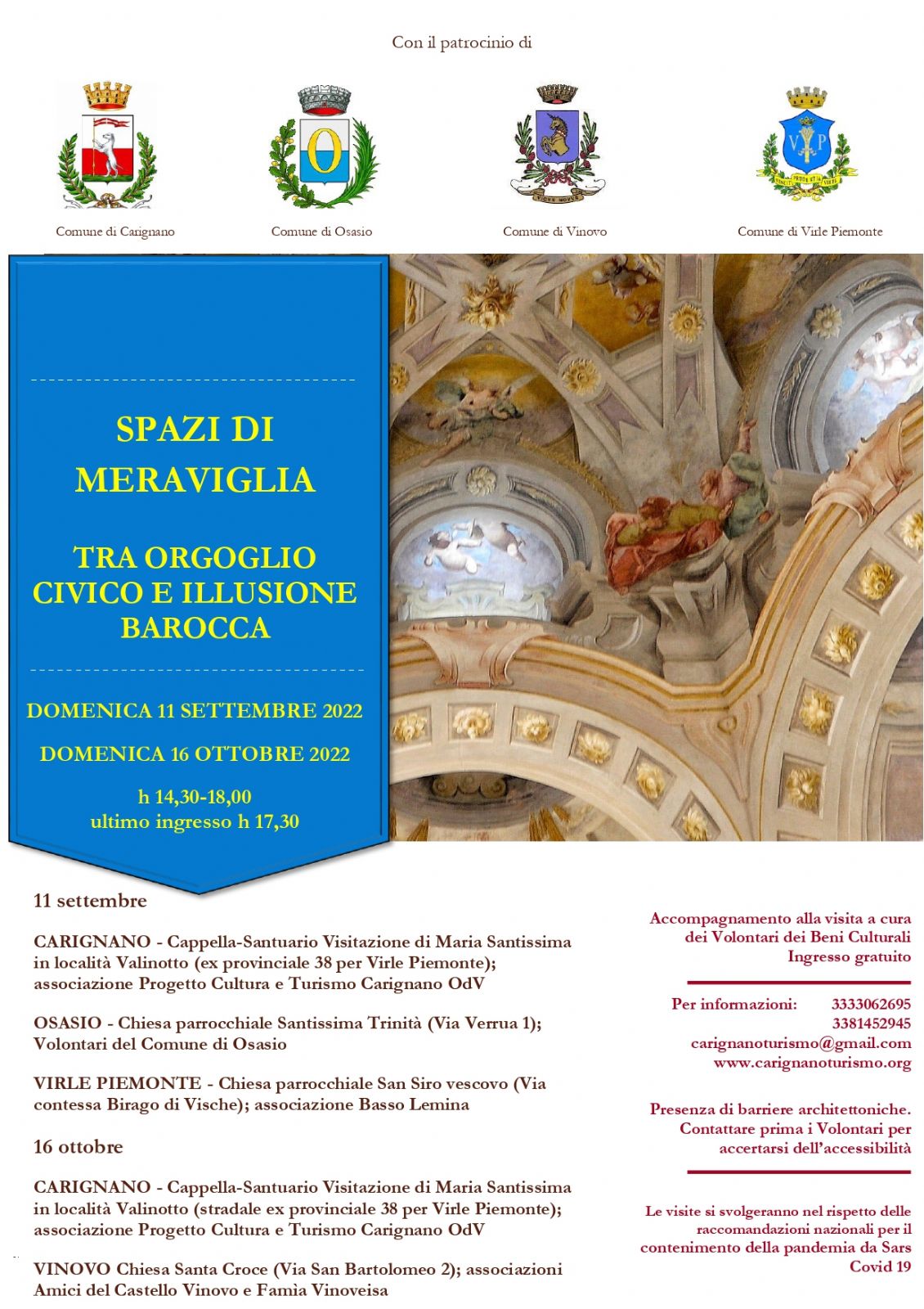 Per informazioni, è possibile contattare il n. 3381452945 oppure inviare una mail a carignanoturismo@gmail.com